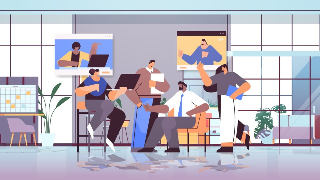 Illustration of a group of employees in HR reviewing digital profiles of people